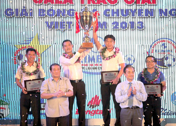 HCM, vào sáng qua. Chủ toạ Nguyễn Quốc Hội và HLV Phan Thanh Hùng nhận Cup vô địch V-League 2013 cho CLB HN.